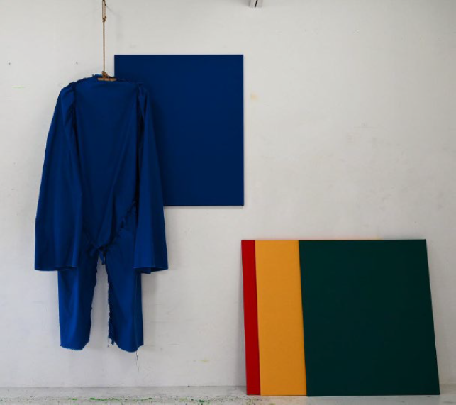 Es besteht aus vier einfarbigen Farbtafeln und einem großen Blaumann. Im Verlauf der vier Wochen können Gruppen, die das Kunstwerk anschauen, auch selber Hand anlegen und die einzelnen Bestandteile umstellen. Weiße Handschuhe liegen bereit, Die Variationen werden in einem Buch dokumentiert.