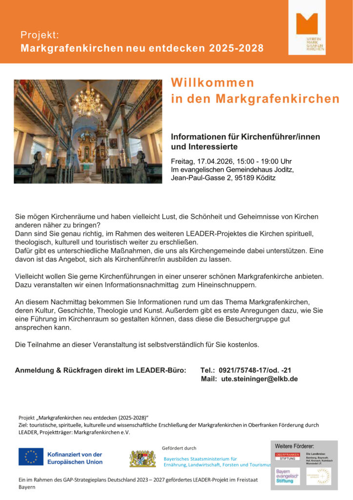 Am Freitag, den 17. April, von 15 bis 19 Uhr, bietet das Team der Markgrafenkirchen eine Kurzschulung zum Kirchenführer in Joditz an. Weitere Informationen hier!